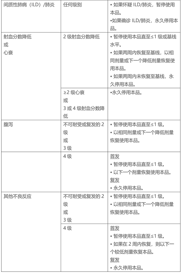 对于疑似ILD/肺炎的患者,立即暂停使用本品,如果ILD/肺炎确诊,则永久停用本品。