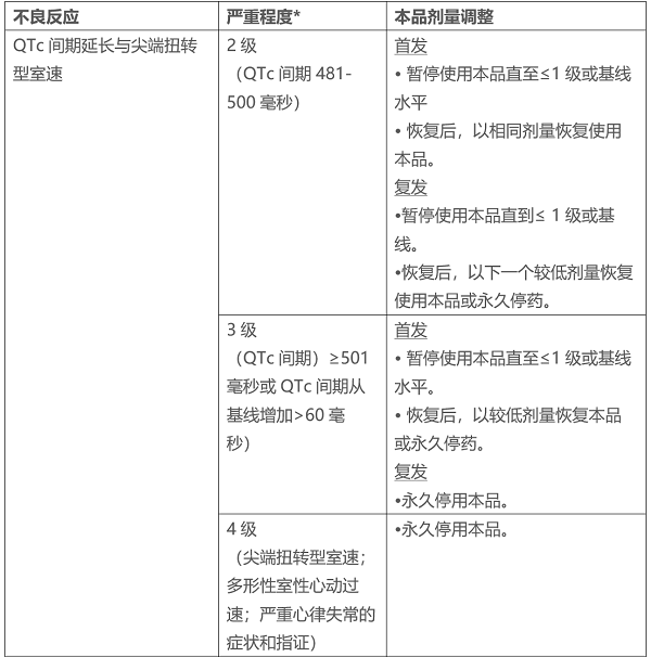 1.长QT综合征和尖端扭转型室速:监测患者服药期间是否出现长QT综合征和尖端扭转型室速,当出现时应根据QTc延长的严重程度,暂停服用、低剂量继续服用或永久停止服用本品。